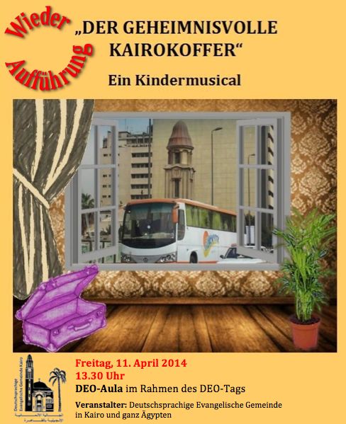 Musicalfreunde aufgepasst! Nach dem großen Erfolg der Uraufführung am 1. März wird unser Kindermusical „Der geheimnisvolle Kairokoffer“ am Freitag, 11. April, um 13.30 Uhr in der Aula der DEO nochmals zu sehen sein. Alle Infos sowie einige Bilder der Uraufführung finden sich hier.