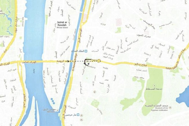 Von Westen kommend (Giza) ändert sich der erste Teil der Wegbeschreibung: Über die südliche Manialbrücke Richtung Sh. Salah Salem fahren, dann auf dem Kreisel einen U-Turn machen und wieder Richtung Corniche fahren und dann rechts neben die Unterführung auf die kleine Parallelstraße zur Sh. Salah Salem. …