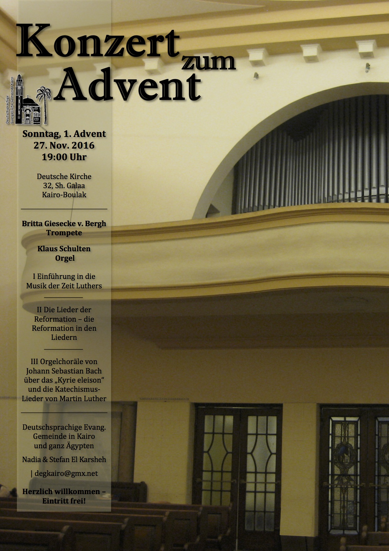 Also, herzliche Einladung zum Adventskonzert am Sonntag, 27. November 2016, um 19:00 Uhr in unserer Kirche in Kairo-Boulak, 32 Sh. Galaa (neben Al-Ahram).