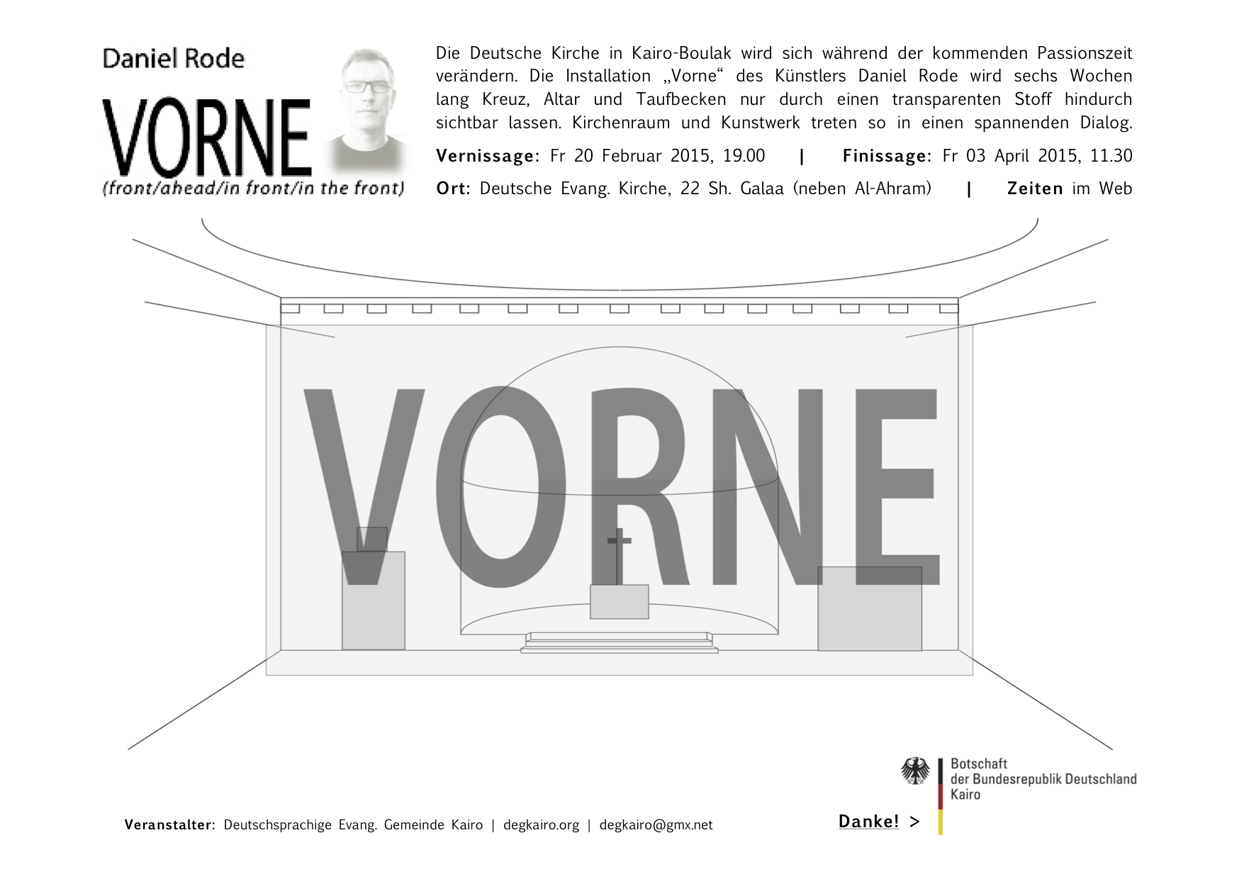 Vom 20. Februar bis 3. April 2015 wird unsere Kirche noch einmal ganz anders erfahrbar sein. Der Künstler Daniel Rode, lange in Kairo lebend, wird mit einem großen transparenten Stoff die Vorderfront der Kirche verhüllen, auf dem schlicht „Vorne“ steht. Nur noch schemenhaft lässt sich dann der Altarraum erkennen. Die Installation lädt uns ein zu grundsätzlichen Fragen: Wenn ich nach vorne nichts mehr sehen kann, ja wo ist dann vorne? Sind Schritte zurück ein Rückschritt? Was kommt nach dem Vorne? Und dergleichen mehr. Aber natürlich kann man auch einfach den Raum und die Installation in ihrer ganzen Größe einfach auch so bewundern und genießen.